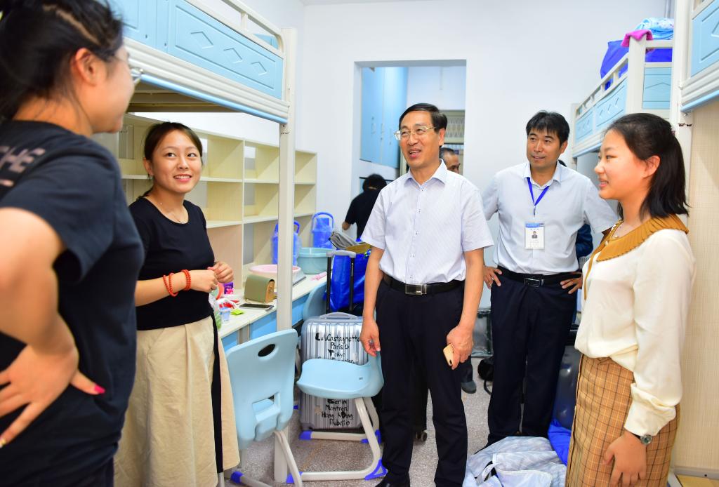 孙鹤汀与校区领导到迎新现场和学生宿舍慰问工作人员、志愿者和新生