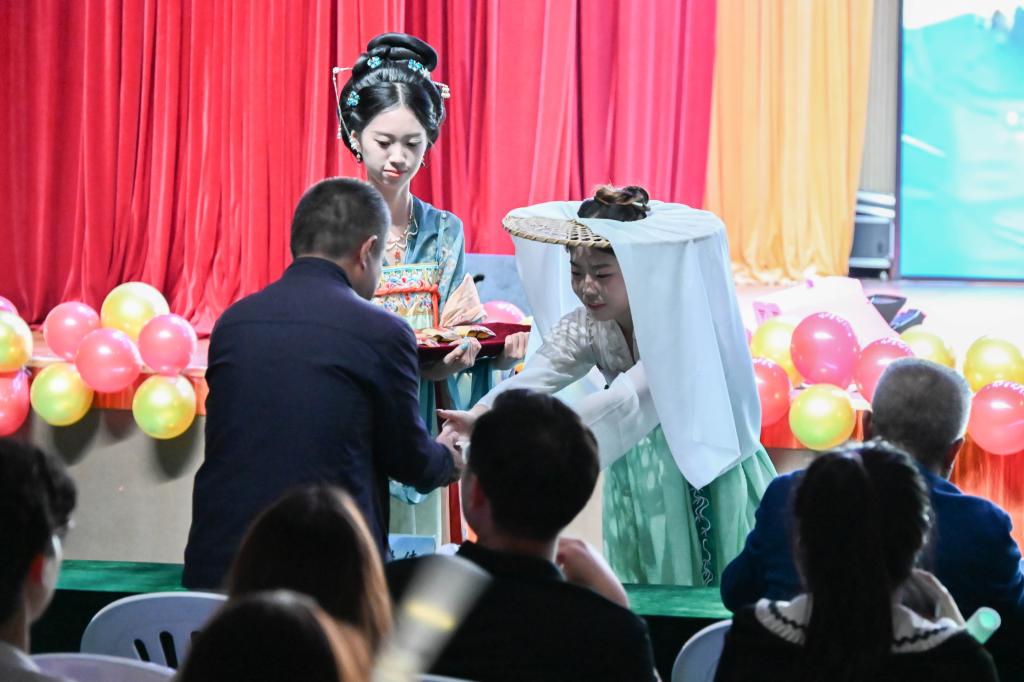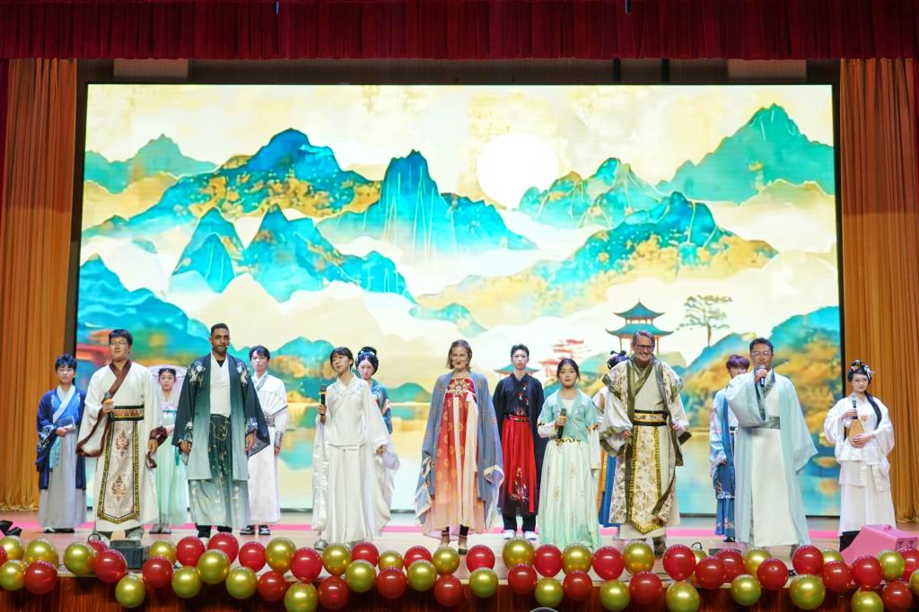 晚会中,由中外师生共同演绎的《唐宋复原秀》成为一大亮点,将现场气氛推向高潮。节目深度融合我校中外合作办学的特色,外教与学生一同身着典雅唐宋汉服登台,以一曲中英文《水调歌头》实现跨越语言的文明对话,并向观众席分发象征团圆的中秋月饼,不仅传递了“天涯共此时”的美好寓意,更以一份甜蜜搭建起师生之间、中外之间情感连接的桥梁。现场欢声笑语、温情涌动,生动诠释了“中外融合、师生同心”的校园文化氛围。(文:徐乐 摄影:冯可欣、魏子格、潘昱曦、江钊宇、赵嘉懿、孟繁棋、李芃菲)