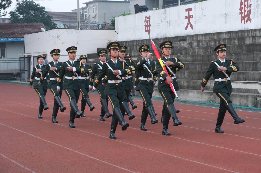 6时30分,国旗护卫队迈着铿锵步伐护送国旗入场。在雄壮的《义勇军进行曲》中,五星红旗冉冉升起,全体师生肃立行注目礼,齐声高唱国歌。
