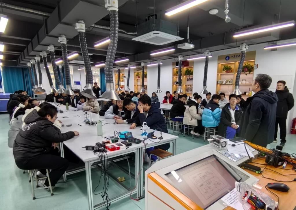电气工程及其自动化专业吕英俊教授带领大家走进 Project 工程素质培养实验室,近距离观摩在校本科生自主研发的机器人、小型收音机等兼具创意与技术含量的科创成果,引发参观学子的广泛关注与热烈讨论;在实践体验环节,吕教授亲自指导学子们参与小型收音机组装,助力大家在亲手完成零件拼接、设备调试过程中,深化对工程制作严谨性与逻辑性的认知,同时他紧密结合高中物理学科核心知识,深入浅出地解析科创作品背后的科学原理,并寄语学子们夯实学科基础、树立远大志向,未来主动投身高等教育深造、深耕专业领域,以青春之力助力国家发展,为实现中华民族伟大复兴的中国梦贡献力量。