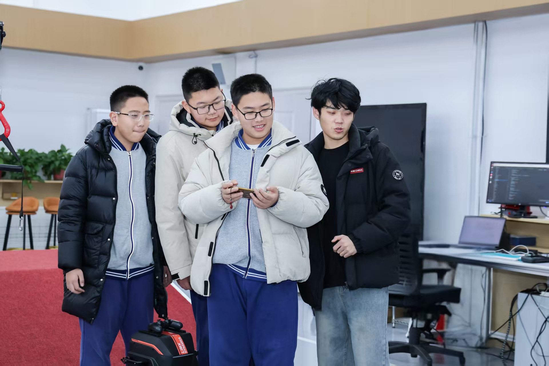 研学最后一站,同学们走进智能机器人科教融合创新中心。校区智能机器人社团负责人吴豪威结合自身学习与参赛经历,为同学们介绍了实验室各类机器人设备的功能特性,以及参与机器人大赛的收获与感悟。在技术演示环节,Unitree G1人形机器人、Unitree Go2-W四足机器人、TRON1多形态机器人依次亮相,灵活的动作展示全方位呈现了智能机器人技术的前沿发展水平,赢得同学们阵阵喝彩。部分同学亲手操控,让机器人完成一系列复杂动作,直观感受智能科技的神奇,进一步点燃了探索科技前沿、追逐科学梦想的热情。